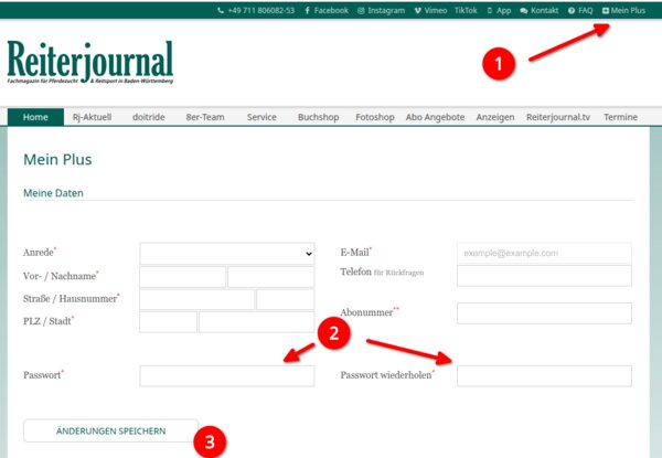 Mit einem Klick auf Mein Plus gelangen Sie in Ihren persönlichen Bereich. Dort können Sie Ihr neues Passwort (s. Punkt 2) angeben. Mit einem letzten Klick auf Änderungen speichern (s. Punkt 2) werden allen Änderungen gespeichert und sofort Aktiv.