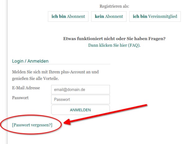 Gehen Sie auf eine Plus-Meldung und bei “Login / Anmelden” klicken Sie auf “Passwort vergessen”. In dem neu erscheinenden Feld “E-Mail Adresse” geben Sie Ihre E-Mail Adresse an, mit der Sie sich bei uns registriert haben. Anschließend noch ein Klick auf “Senden” und Sie bekommen per E-Mail ein neues Passwort zugesandt.