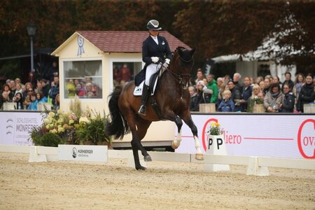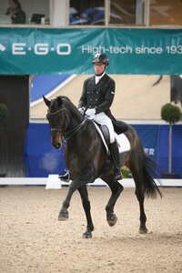 Nach ihrem Sieg in der Einlaufprüfung gewinnt Joana Peterka auch die zweite Prüfung, Wertung für den Piaff-Förderpreis U25. Mit ihrem 14-jährigen Davidoff ter Kwincke aus der niederländischen Zucht erhielt sie 69, 791 Prozent für eine souveräne Vorstellung auf einem sehr zufrieden wirkenden Pferd. Gelungene ...
