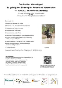 Bald ist es soweit: Am 16.6. startet um elf Uhr der spannende Informationstag der Initiative Vielseitigkeit in Altensteig auf der Anlage von Ponybundestrainer Rüdiger Rau. Hochkarätige Referenten geben bei diesem einmaligen Event von A bis Z Einblicke in die Faszination Vielseitigkeit. Sowohl interessierte ...