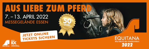 Feiern Sie mit uns das diesjährige Jubiläum der Equitana! Als Reiterjournal-Abonnent erhalten Sie für die Veranstaltungstage Montag, Dienstag und Mittwoch 11. bis 13. April 2022 der Equitana vergünstigte Tickets. Das Ticket-Special ist nur über den Online-Verkauf verfügbar. Bestellen Sie sich Ihre Tickets ...