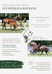 Am Freitag, den 14. November 2025 um 19 Uhr lädt der Pferdezuchtverein Pfullendorf-Bodensee e. V. zum Züchterstammtisch ins Reiterstüble Brunnhausen nach 88630 Pfullendorf ein. Der bekannte Hippologe Claus Schridde, u. a. Redakteur der bekannten Fachzeitschrift ZÜCHTERFORUM, hält einen Vortrag (Powerpoint-Präsentation) ...