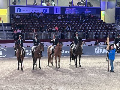 Das Mannschaftsspringen am Messeturnier im sächsischen Chemnitz ist immer eine besondere Prüfung im Jahr: Am Freitagabend schlug sich das Team Baden-Württemberg durchaus achtbar. In der Besetzung mit Landesmeister Günter Treiber (Eppelheim) mit Nanu Nana, Elisabeth Meyer aus Villingendorf mit Destiny, ...