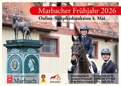 Die Kollektion der Gemeinschaftsauktion „Marbacher Frühjahr 2026“ ist online. Der Pferdezuchtverband Baden-Württemberg e.V. und das Haupt- und Landgestüt Marbach präsentieren erstmalig eine gemeinsame Verkaufskollektion, die am Montag, den 4. Mai ab 18 Uhr im Rahmen einer Online Auktion versteigert ...