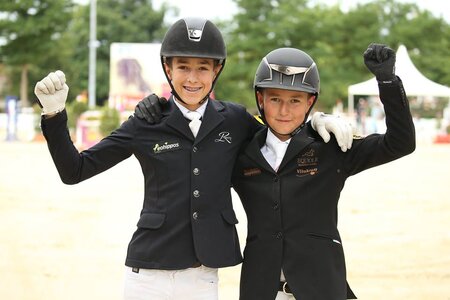 Die starken Kerle vom Erdbeerhof: Das sind Lukas Weiler bei den Children im Springen und Moritz Treffinger in der Pony-Dressur. Die beiden Nordbadener haben einiges gemeinsam und sind sogar gute Kumpel. Sie trainieren beide auf dem Erdbeerhof der Familie Deuerer in Gondelsheim bei Bruchsal. Treffinger ...