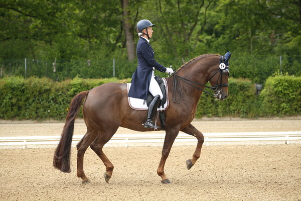 Dennoch siegte sowohl Martina Steisslinger gestern, als auch Miriam Alber heute mit beachtlichen 69 Prozent. Ihre Don Larino-Tochter Diva Larina hatte Alber gesattelt. Mit ihr gelang der Onstmettinger Ausbilderin in Offenburg vor einigen Monaten schon der 90. S-Sieg ihrer Karriere. Damals auf Ein-, heute auf Drei-Sterne-Niveau. Der 100. S-Sieg im Oberhaus scheint noch in der laufenden Saison zu gelingen. Auf Augenhöhe konnte nur noch Holger Schulzes langjährige Schülerin Natalie Gauß im Sattel von Fine Emotion mitmischen. Nur sieben Punkte fehlten auf den Pokal. Ina-Katrin Schmid bei M handelte das Paar aus Lautertal als Sieger. Verständlich, schenkten sich die beiden an der Spitze wahrlich nichts. Auf Platz drei brachte Schetter selbst seinen Dirigvel. Vor einem Jahr war der Elfjährige aus Großbritannien nach Deutschland gekommen, nachdem zuvor eine Schwedin den imposanten Hengst erfolgreich auf Turnieren präsentierte. Auch mit Markus Schetter findet Dirigvel besser und besser zusammen. Von den beiden könnte man schon bald noch mehr hören... (FA)