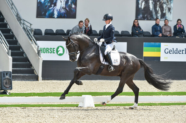 Fast hätte er es geschafft! Im heutigen Finale der fünfjährigen Dressurpferde bei der WM in Ermelo musste sich die Baden-Württembergische Hoffnung, der DSP-Hengst Secret v. Sezuan/St. Moritz (Z.: Hubert Vogler, B.: Gestüt WM), mit nur 0,2 Punkten geschlagen geben. Unter seiner Reiterin Jessica Lynn Thomas erhielt der Rappe zweimal die Höchstnote 10,0 – für den Galopp und die Perspektive. Am Ende schlug ein Ergebnis von 9,64 zu Buche – Rang zwei und damit der Vizetitel! Neuer Weltmeister wurde der KWPN Hengst Jovian unter Andreas Helgstrand. Für den Apache-Tango-Sohn (Z.: E.T. ten Bosch, B.: Helgstrand Dressage) gab es von den Richtern gleich viermal die Höchstnote 10,0! Lediglich im Schritt musste sich der Hengst mit einer 8,3 begnügen. Jovian hatte bereits dreijährig das niederländische Championat der Reitpferde überlegen gewonnen, verließ die dänische Körung 2018 als Prämienhengst und gewann seine beiden Sporttests in Münster-Handorf.
