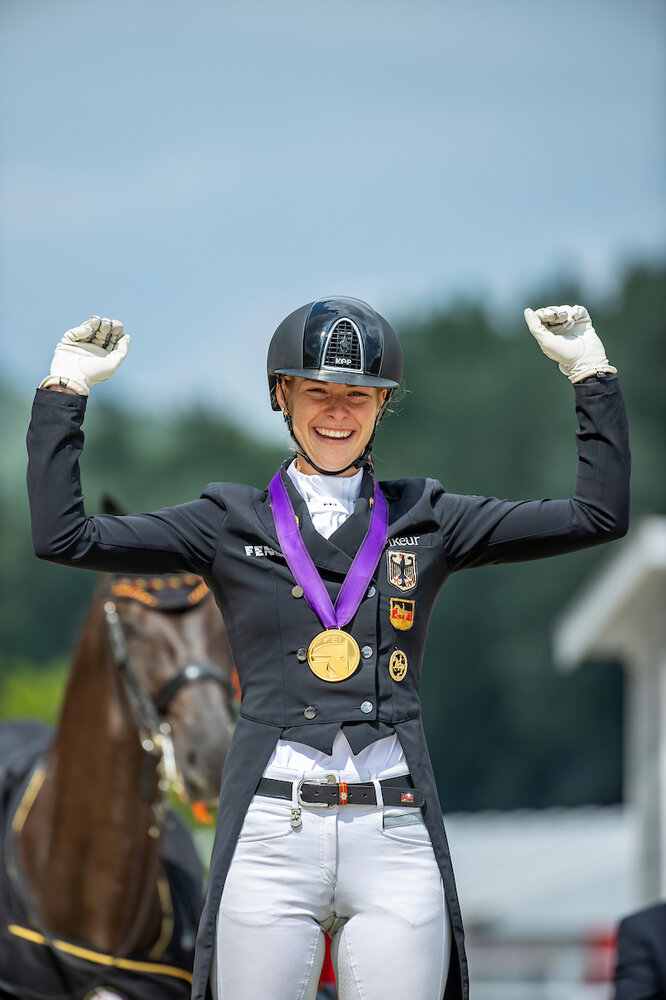 Zum Ritt von der neuen Europameisterin: 75,590 Prozent - das bedeutete ein persönliches Bestergebnis für die beiden. Und es war eine Vorstellung vom Allerfeinsten. Der Auftakt mit Einreiten, Halten, Grüßen - besser hätte man es nicht machen können. In den Piaffen könnte der Württemberg noch etwas mehr Fleiß zeigen, da gerät er immer mal leicht ins Stocken, aber in der zweiten war es schon besser als in der ersten. Toll die Passagen, mit ganz viel Power, die Schritttour deutlich besser als gestern. Wie schon am Vortag überzeugte Sunfire in der Galopptour mit viel Go nach oben und vorne. Die Einerwechsel waren leicht schwankend, aber sicher gesprungen. Das war ein Ritt, mit einer jungen Dame im Sattel, die ihr reiterliches Können unter Beweis stellte und mit ihrem Partner eine perfekte Einheit bildete. Stark!
