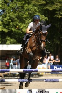 Die Spannung lag spürbar in der Luft! In der heutigen Ponyspringprüfung der Klasse M ging es heute um alles. Das Springen war fair gebaut mit langen Linien, eine dreifache Kombination und eine knifflige letzte Linie bildeten die Klippen der finalen Prüfung. Nach Wertungsprüfung eins und zwei, lag Elena-Malin Reitzner klar auf Goldkurs. Die 16-Jährige hatte mit ihrem „halben“ Haflinger Gordi beide Prüfungen gewinnen können. Im entscheidenden Parcours zündete Gordi wieder den gewohnten Turbo, ließ sich kaum bremsen. Ein leichter Fehler verhinderte zwar die Stechteilnahme, allerdings nicht den Titelgewinn. Die Walldorferin, die Gordi bereits seit sechs Jahren besitzt, mauserte sich in seinem Sattel vom Springreiterwettbewerb bis zum Süddeutschen Meistertitel heute, die Krönung der Pony-Zeit, die nun für Elena Reitzner zu Ende geht. Das Nachwuchstalent aus Walldorf trainiert bei Barbara Roth, zu deren Familie Gordi früher gehörte, die Pferde sind im eigenen Stall der Eltern beheimatet.