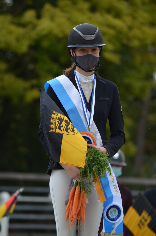Unglaublich stark präsentierte sich Wibke Zollmann mit Mr. Bubble im finalen Springen über 1,25 Meter. Nach einer tadellosen Nullrunde, bei der der wunderschöne Schimmelhengst kräftig an jeden Sprung passend heranzog, blieb die Waldbrunnerin auch im Stechen ohne Fehler. Am Ende wurde es Rang zwei hinter Teresa Häsler und Berkzicht Rob aus Sachsen. Zollmann gehörte zusammen mit Goldmedaillengewinnerin Elena Reitzner, Lena Erkner und Anika Ott auch zur erfolgreichen Springmannschaft aus dem Ländle. Unter Aufsicht von Disziplintrainer Matthias Müller gewann Baden-Württemberg Silber in der Mannschaftswertung, vor den Bayern auf dem Bronzerang.