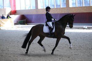 Bei den Junioren wird es morgen in die entscheidende Kür gehen. Besonders erfreulich aus baden-württembergischer Sicht: Alle vier (!!!) Paare aus dem Ländle schafften den Sprung ins Finale, zwei von ihnen liegen aktuell sogar auf Medaillenkurs. Mit 73,342 Prozent konnte Lena Merkt sich zum Vortag nochmals deutlich steigern. Mit Sarotti Mocca-Sahne wurde die Mannschafts-Europameisterin damit Zweite, auch in der Zwischenwertung liegen die beiden aktuell auf Silberkurs. Der Sieg in dieser Prüfung ging an ihre Euro-Teamkameradin Jana Lang aus Bayern, die mit Baron und starken 75 Prozent nicht nur diese Prüfung für sich entschieden hatte, sondern sich mit dem Sieg heute auch die Pole Position der Meisterschaftswertung erkämpft hatte. Weiterhin Chancen auf eine Medaille kann sich auch Pia Casper vom Gestüt Birkhof ausrechnen. Im Sattel des erst achtjährigen Fair Game wurde sie erneut Dritte und liegt damit auf Bronze. Emily Rother und Jasper nahmen als Neunte eine Schleife entgegen. Fiona Serafina Lukas und Aragorn verpassten am heutigen Samstag zwar die Platzierung, aber nicht den Sprung ins Finale. (akb)