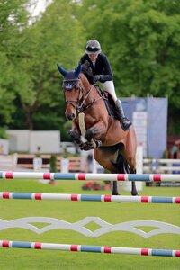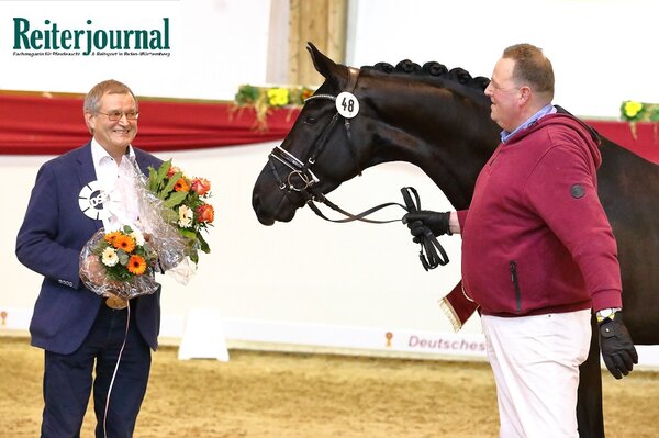 Vornweg, als Dressursieger 2022 trabte der lackschwarze Sohn des Don Royal aus einer Quadroneur-Mutter aus der Erfolgszucht von Dr. Frank Klakow. Sportkommissar Jörg Schrödter kam bei seinem Kommentar ins Schwärmen: „Dies ist ein Pferd, welches seinesgleichen sucht!“ Der Rappe zeigte sich über alle Tage hinweg temperamentsüberlegen, stehts angenehm ruhig und trotzdem auf den Punkt präsent. Mit dynamischen Grundgangarten präsentierte er sich mit sehr guter Balance, in den Verstärkungen immer bedeutender werdend. Schrödter prophezeite ihm eine große Karriere für Sport und Zucht. Für seine züchterischen Verdienste wurde Dr. Frank Klakow mit der FN-Plakette in Gold ausgezeichnet.