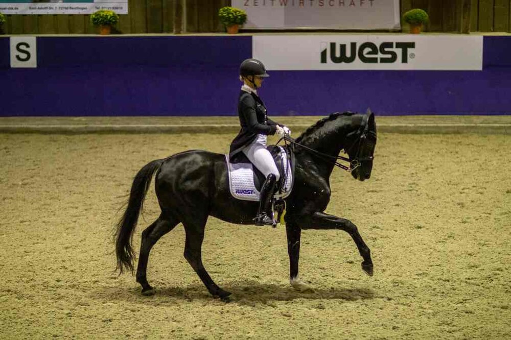 Eine der großen Pferdepersönlichkeiten des baden-württembergischen Dressursports lebt nicht mehr. Der Trakehner Titan, der unter Vera Breidenbach unter anderem das iWest-Finale in Reutlingen 2020 gewann, musste Anfang der Woche eingeschläfert werden, nachdem er sich beim Freilaufen ein Bein gebrochen hatte. Titan, Sohn des legendären Biotop, wurde 20 Jahre alt. "Eigentlich war er noch topfit und hatte noch so viel Spaß, dass wir uns gerade entschieden hatten, ihn nochmal als Lehrpferd einer Children-Reiterin zur Verfügung zu stellen", berichtet Vera Breidenbach - sichtlich mitgenommen. Es gab nur wenige Reiter-Pferd-Beziehungen wie diese. Vera Breidenbach hat den eleganten Rappen aus der Zucht von Christine Hauter in Andernach als junges Pferd von seiner Besitzerin Lena Thoenis in Ausbildung bekommen und bis zur Drei-Sterne-Klasse gefördert.