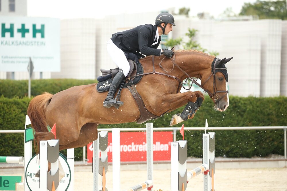 Drei Springen der Schweren Klasse bot das Turnier in Darmstadt-Kranichstein und dreimal führte kein Weg vorbei an Richard Vogel. Bereits am Donnerstag entschied der 24-Jährige im Sattel der Holsteiner-Stute Charisma mit über drei Sekunden Vorsprung die Springprüfung der Klasse S* für sich. Am darauffolgenden Tag holte sich Vogel den Doppelsieg. In der Zwei-Phasen-Prüfung über 1,40m galoppierte der Profi auf DSP-Hengst Carlchen zum Sieg, mit dem 10-jährigen Cassito-Sohn Churchill (Z.: Josef Gronmayer) landete Vogel auf Rang zwei. Auch die Geschwister Krieg waren in dieser Prüfung erfolgreich. Niklas Krieg sicherte sich im Sattel von Quater past den vierten Platz, mit Alexis belegte er Rang neun direkt hinter Schwester Leonie Krieg, die den Holsteiner-Wallach Cashmere gesattelt hatte. Auch im Großen Preis am Sonntag, einem S*-Springen mit Stechen, war Richard Vogel nicht zu schlagen. Er hatte gleich drei Eisen im Feuer. Im Stechen, in welches lediglich drei Paare einzogen, hatte der Top-Reiter auf Schimmelhengst Churchill die Nase vorn und sicherte sich mit dem Come il faut-Sohn Carlchen Rang drei. Trotz Fehler im Umlauf platzierte sich Vogel ebenfalls noch mit der Uriko-Tochter Charisma auf dem achten Platz. Günter Treiber verpasste zwar knapp den Einzug ins Stechen, landete jedoch im Sattel seiner drei Pferde Emadermus, Curtis und Top Gun auf Rang vier, fünf und sechs. (lb)