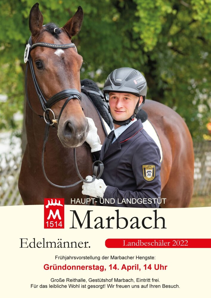 Am 14. April um 14 Uhr präsentiert das Gestüt eine Auswahl der neuen Zuchthengste für die Zuchtrichtungen Dressur und Springen, Veredler und Sportponys sowie bewährte Landbeschäler in der großen Marbacher Reithalle. Nicht nur für Zuchtbegeisterte bietet die Frühjahrsvorstellung eine gute Gelegenheit, sich die Hengste noch einmal live auf dem Gestütshof Marbach anzusehen. Der Eintritt zur Vorstellung ist kostenlos.