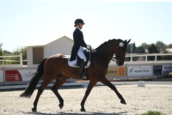 Für Anna Gunst läuft es im Moment wahrlich gut. Nach dem Sie mit ihrem 19-jährigen Wallach Despino schon Anfang des Jahres beim Dressurturnier in Biberach Rißegg ihren ersten S-Sieg feierte und etliche vordere Platzierungen folgten, siegte sie gestern in der Rottweiler S-Dressur auf ein Sterne Niveau. Das Paar punktete besonders in den doppelt zählenden Trabtraversalen und Galopppirouetten, für welche sie mehrfach die Acht erhielten. Am Ende durfte sich die Schülerin von Jasmin Schaudt nicht nur über die goldene Schleife freuen, sondern ebenso über 69,6 Prozent. Chiara Rüesch war der Siegerin am dichtesten auf den Fersen. Die Schülerin von Andrea Knoll landete mit einer gleichmäßigen Runde und 68,8 Prozent auf dem zweiten Platz. Highlights ihrer Prüfung mit ihrem 17-jährigen Wallach Aron waren die Trabtraversalen und die Schritttour. Sie verlor bei fehlerhaften Viererwechseln Punkte. Auf dem dritten Rang rangierte Maren Schatz, die mit ihrem elfjährigen Wallach Sacramento immer besser zurecht kommt. Nach ersten S-Platzierungen Ende des letzten Jahres folgte gestern für die Schülerin von Andrea Knoll die erneute Platzierung. Auch Schatz misslangen die Viererwechsel. Die Schülerin von Jürgen Bimmel Leonie Moll und Hanne Henning landeten auf den Plätzen vier und fünf. Leonie Moll punktete v.a. in den Serienwechseln und verlor wertvolle Punkte in den Trabverstärkungen, in welchen Bright Bellini jeweils angaloppierte. Die Bereiterin im Stall Bimmel Hanne Henning ist normalerweise in der Vielseitigkeit unterwegs und feierte gestern bei ihrem ersten Start in der schweren Klasse zugleich ihre erste S-Platzierung. Lisa Casper, Friedrich Steisslinger und Anna-Lisa Stotmeister ritten ebenso in die Platzierung.