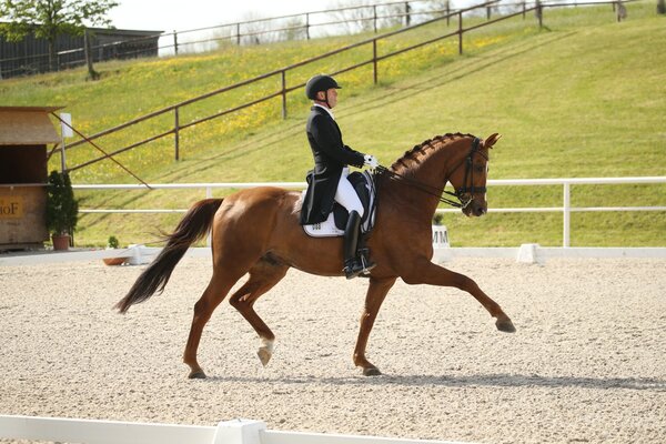 Äußert zufrieden konnte Markus Schetter vom Dressurturnier im bayrischen Notzing nach Hause fahren. Denn er siegte mit seinem routinierten 15-jährigen Wallach Don`t stop moving im Prix St.Georges. Für eine sehr gleichmäßige Trabtour mit Höhepunkten in den Seitengängen und in der Galopptour mit toll zentrierten Galopppirouetten erhielt das Paar 69,1 Prozent. Einzig und allein in den Dreierwechseln schlich sich ein kleiner Fehler ein, als Don´t stop moving den letzten Wechsel einen nach der Hilfe sprang. Schetter verwies mit seiner Runde die sehr erfolgreiche Kristina Olson mit FBW Dory´s Dream, Finalisten des IWEST-Cups im letzten Jahr, auf den zweiten Platz. Auf Platz drei rangierte Mai Fee Goldmann aus Aubenhausen. Ein weiterer "prominenter" Gast aus Aubenhausen ritt ebenso in die Platzierung: Raphael Netz saß im Sattel von Forsazza de Malleret, Nachwuchshoffnung von Jessica von Bredow-Werndl, und platzierte sich auf dem siebten Platz. Markus Schetter durfte sich auch in der abschließenden Intermediaire I über eine Platzierung freuen. Das Paar rangierte mit 67,4 Prozent auf dem fünften Platz. Nach einer sehr ausdrucksstarken Trabtour verloren sie im Rückwärtsrichten und in den Zweierwechseln wertvolle Punkte. Der Sieg ging an Ferdinand Csaki und Las Vegas (71,4 Prozent).