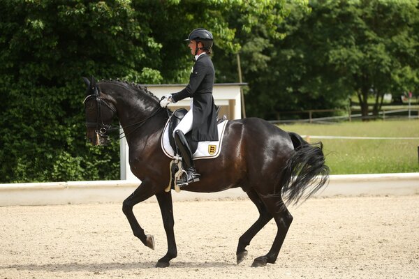 Eigentlich gilt Olympiasiegerin Dorothee Schneider bei Starts in der Provinz als unschlagbar. Jetzt nicht mehr. Im Ludwigsburger Monrepos-Schlosspark zeigte Janina Kahl aus Magstadt im Sattel ihres Rappen Emiliano eine sensationelle Leistung und siegte im Grand Prix-Finale am Sonntagmittag mit sagenhaften 74,6 Prozent. Es war ihre bisherige Bestleistung und ihr erster Sieg in einem offenen Grand Prix. Der 13-jährige Holländer hat sich nochmal deutlich gesteigert, ist sportlicher und noch elastischer geworden. Er piaffiert wie am Schnürchen. Die Amateur-Dressurreiterin freute sich zurecht über diesen bislang wichtigsten Sieg ihrer Karriere. Kein Geringerer als Dr. Dietrich Plewa vergab für den Siegesritt sogar über 77 Prozent der Punkte!
