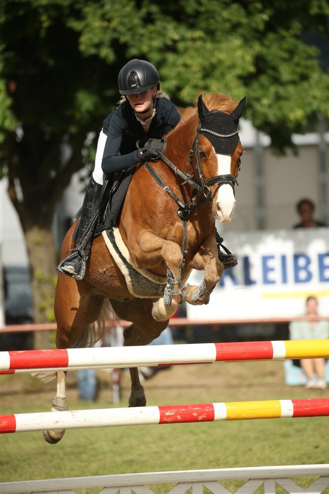 Nachdem sich Lea Sophia Gut am Samstag in einem Ein-Sterne-Springen im Sattel ihrer Stute Canturia knapp geschlagen geben musste, gelang der jungen Amazone am heutigen Tag der Sieg in der abschließenden Springprüfung der Klasse S** mit Stechen. Vier Teilnehmerinnen hatten sich nach einem fehlerfreien Umlauf fürs Stechen qualifiziert, dabei blieb die amtierende U-25 Landesmeisterin mit der 13-jährigen Canturo-Tochter als einziges Paar fehlerfrei – und das auch in der schnellsten Zeit. Auf dem zweiten Platz reihte sich Elisabeth Meyer aus Villingendorf ein. Mit dem erst achtjährigen Clarimo-Nachkomme Crisscross musste die Amazone allerdings einen Fehler in Kauf nehmen. Mit ebenfalls vier Strafpunkten rangierte Nadine Legros mit Cassilia auf Platz drei. Den vierten Rang belegte Julia Baur, die den neunjährigen Oldenburger-Wallach Cortez gesattelt hatte. Bereits am Vormittag ritt Baden-Württembergs Spitze in einem Zwei-Phasen-Springen auf S-Niveau um den Sieg. Manuel Feige und die siebenjährige Kannuma beendeten die zweite Phase als schnellstes Paar ohne Fehler. Dicht dahinter reihte sich Vortagessieger Mario Walter ein, der den Holsteiner Ducati gesattelt hatte. Dritte wurde die Pfullingerin Kristina Volk mit ihrem Diamond Touch. Auch die Ponyreiter hatten einen Zwischenstopp im Badischen eingelegt, denn Weingarten ist eine der Stationen des Pony-Spring-Masters. Es waren Allegra Hüttig und ihr Sietlands Gustav, die den L-Parcours als einziges Paar fehlerfrei überwanden und sich damit eindeutig die goldene Schleife sicherten. Über zwölf Sekunden langsamer waren Vroni Grüber und der sechsjährige Densborns Leckerli, die somit den zweiten Platz belegten. Mit ihrem Zweitpony Lara, mit der die junge Dame aus Waldbrunn am Vortag ihren ersten M-Sieg feierte, sicherte sie sich außerdem den vierten Rang. Auf den dritten Platz galoppierte Elisabeth Maria Geisinger im Sattel von Cupcake. (lb/Fotos: D. Matthaes)