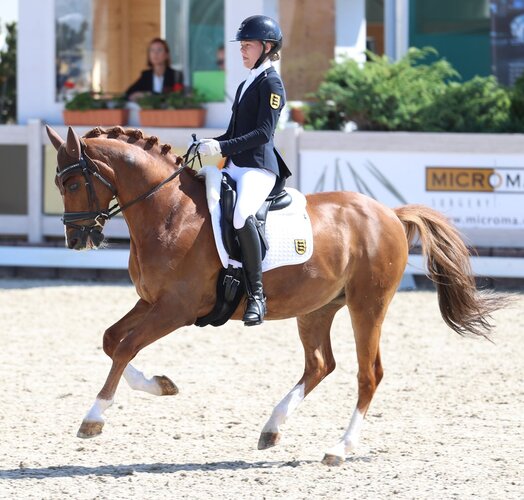 Im Moment reitet Leni Sophie Wächter von Erfolg zu Erfolg. Nach ihrem Start beim Preis der Besten siegte die junge Dame heute in der ersten Etappe des Ponymasters. Leni zeigte im Viereck der Winterlingen Winners mit ihrem Professor Ballack eine Runde, die nur wenige Wünsche offenließ. Highlights wie u.a. mit 8-er Noten bewertete einfache Galoppwechsel sowie eine starke Schritttour führten zu einem starken Ergebnis von 73 Prozent. Für eine kleine Überraschung sorgte Cecile Mutz mit dem zehnjährigen Capri au Lait. Sie folgte Leni mit 71,7 Prozent auf dem zweiten Platz. Durch eine sehr rittige Vorstellung mit sehr guten einfachen Galoppwechseln knackte das Paar erstmals die 70-Prozentmarke. Auf dem dritten Platz rangierte ebenso ein aufstrebendes Paar. Ann-Sophie Mayr und ihre FBW Mary Poppins knackten heute auch erstmals die 70-Prozentmarke und durften sich mit 70,1 Prozent über die weiße Schleife freuen. Leni Sophie Wächter durfte sich mit ihrem zweiten Pony Colourful Cannonball über eine weitere Platzierung freuen und rangierte mit 68,8 Prozent auf dem vierten Platz. Auf dem fünften Rang platzierte sich ebenso ein aufstrebendes Paar. Amelie Bertazzoni sammelte erst letztes Wochenende ihre ersten FEI Platzierungen mit ihrer Stute Classic Claire. Heute erhielten die Beiden gute 68,7 Prozent. Jana Reichl und Belagio freuten sich als Letztplatzierte mit 68,2 Prozent ebenso über eine Platzierung.