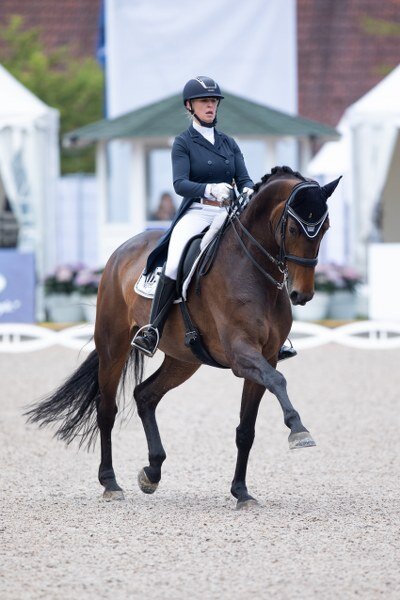 Hut ab! Das war einsame Spitze, was Anna Casper und Donna Clara in der heutigen Grand Prix Kür der U25-Dressurreiter zum Besten gaben. Am Abschlusstag der Deutschen Meisterschaften in Balve hatte Anna Casper die elfjährige Hannoveranerin Donna Clara aus dem Besitz von Holger Schulze zu 100 Prozent auf ihrer Seite. Mit gespitzten Ohren wartete die Nachkommin des Don Crusador auf die kleinsten Signale ihrer Reiterin und setzte die Anforderungen in Bestform um. Nach einer ausdrucksstarken Passage-Tour zu den James Bond-Klassikern, ritt die Amazone vom Gestüt Birkhof sehr gute, doppelt gedrehte Pirouetten. Auch die Wechsel waren heute ein echtes Highlight der Kür, ganz nebensächlich, dass Anna Casper dabei ihren Bügel verlor. Es klappte auch so – und wie! Die mehrmalige Landesmeisterin wurde für die blitzsaubere Vorstellung mit Donna Clara mit 75,625 Prozent belohnt, was am Ende einen starken vierten Platz in der Endabrechnung bedeutete. Für die mehrmalige Landesmeisterin aus Donzdorf war es ihre Meisterschafts-Premiere bei den „Großen“, sie wird diese nach der heutigen Kür, die sie mit einem breiten Strahlen und ganz zurecht überglücklich verließ, in langer Erinnerung behalten.