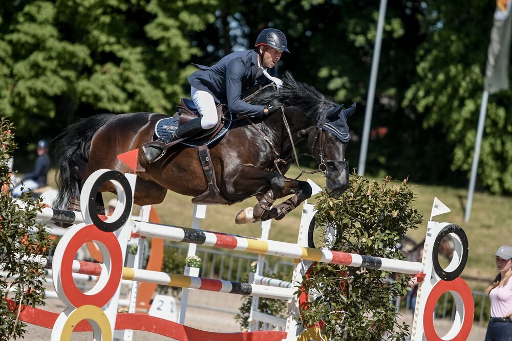 Es war Julian Stahl, der am Sonntag das S*-Springen in Böblingen für sich entschied. Im Sattel seines DSP-Wallachs Prinz Paolino war der Stuttgarter wieder einmal rasant unterwegs und übernahm somit die Führung. Erst kürzlich hatte das Duo den Großen Preis von Tübingen auf Zwei-Sterne-Niveau gewonnen. Doch dann kam Sven Speidel mit Dawson in die Bahn galoppiert, um dem Prinzen den Thron streitig zu machen. Als die Uhr bei 70,51 Sekunden stehen blieb war klar – es hatte nicht ganz zum Sieg gereicht und so musste sich der Ostälbler knapp geschlagen geben. Rund drei Sekunden langsamer war Rainer Schwab, der den 14-jährigen Schimmelwallach Dum Drum gesattelt hatte und sich somit den dritten Platz sicherte. Knapp dahinter landeten Thomas Wiedermann und der Chacco-Blue- Sohn Cookie auf Rang vier. Kai Ruggaber, Bereiter des Hofguts Albführen, reihte sich mit einer stilistisch tadellosen Runde im Sattel des Oldenburger-Wallachs Cliostan auf Platz fünf ein. Mit einer weiteren fehlerfreien Runde platzierte sich ebenso Armin Engelhardt mit OBC Cenwood. Trotz stark besetztem Starterfeld blieben lediglich sechs der 25 Teilnehmer fehlerfrei. Die dreifache Kombination hatte ihre Tücken und so fielen am mittleren Sprung, einem breiten Oxer, die meisten Stangen. (lb)