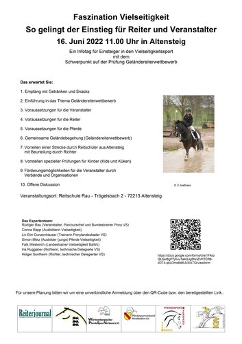 Bald ist es soweit: Am 16.6. startet um elf Uhr der spannende Informationstag der Initiative Vielseitigkeit in Altensteig auf der Anlage von Ponybundestrainer Rüdiger Rau. Hochkarätige Referenten geben bei diesem einmaligen Event von A bis Z Einblicke in die Faszination Vielseitigkeit. Sowohl interessierte Neueinsteiger in diese Disziplin, als auch Turnierveranstalter sind herzlich willkommen! Die Anmeldung ist über den QR-Code möglich! (wentsch)