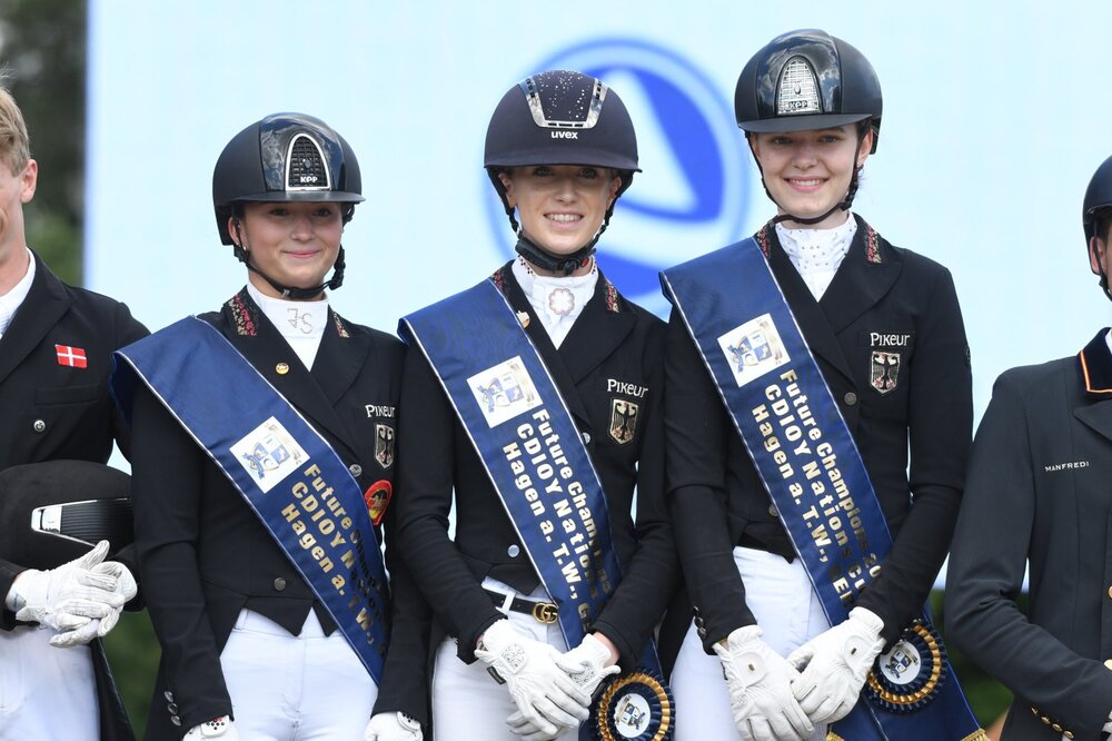 Erfolgreicher Nationenpreistag bei den Future Champions für Deutschland: Sowohl die Junioren als auch die Jungen Reiter sichern sich den Sieg im Nationenpreis der Future Champions von Hagen. Bei den Jungen Reiter ritt Jana Schrödter im Team der drei deutschen Reiter mit. Die Berufsreitertochter zeigte mit ihrem Der Erbe eine sehr gute Trabtour, wonach sie bei 73 Prozent lag. Leider kam es in der Schritttour zu reichlich Spannung und der 14-jährige Wallach zackelt im versammelten Schritt mehrmals an. Die Anspannung zog sich bis in die Galopptour, u.a. kam es dadurch zu Schwungverlusten in den Galopppirouetten. Am Ende erhielt das Paar 70 Prozent, rangierte in der Einzelwertung auf Rang sechs und durfte sich mit Lucie-Anouk Baumgürtel und Helena Schmitz Morkramer über den Sieg im Nationenpreis freuen. Lucie-Anouk Baumgürtel und ihr ZINQ Hugo führten das Feld der Jungen Reiter mit starken 75,9 Prozent an.