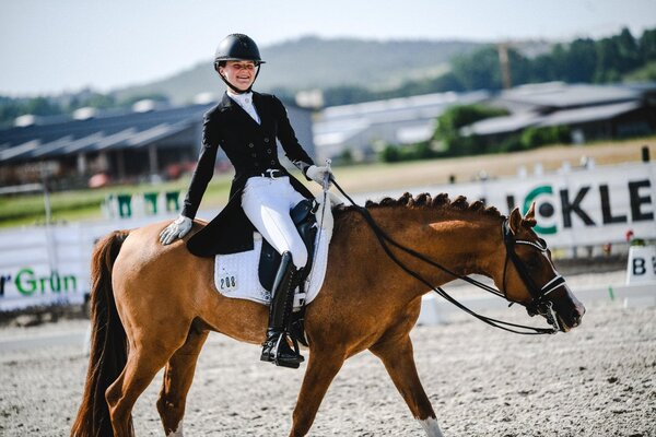 Ann-Cathrin Rieg hatte den 2017 gekörten Derrick Ende 2019 erworben. Nach einem schweren Unfall war der mehrmalige Finalist des Bundeschampionats monatelang ausgefallen und kämpfte sich anschließend umso stärker zurück. Zunächst in Dressurponyprüfungen mit Traumnoten bis weit über die Acht, danach in M-Dressuren. Immer wieder behauptet sich der imposant aufgemachte Ponymann gegen die Großpferde-Konkurrenz, so nun auch auf S-Niveau.