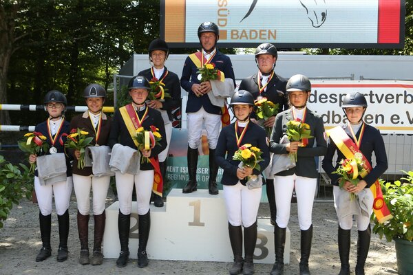 Bei den Junioren sicherte sich Lara-Sophie Strom auf der flinken Stute Nectarine v.d. Wart ihren ersten Regionaltitel, nachdem sie im Finalspringen gute Nerven bewiesen hatte. Die junge Dame aus Schwenningen wird von Sönke Aldinger trainiert; sie war als Children schon im Landeskader. Lea-Sophie Strohm fing im Finale Lea Hurrle mit Penny Lane auf den letzten Metern ab; die junge Dame – gut beraten und beritten – wird ihren Weg machen. Bronze ging an Magdalena Rose aus Klettgau im Sattel von Tinka Bell. Über ihre Fortschritte war Regionaltrainer Nikol Lauer besonders erfreut (rok/Foto: Doris Matthaes)