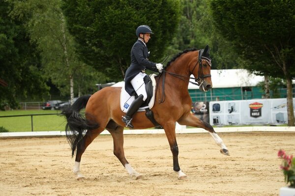 Mit ihrem zweiten Pferd, dem 12-jährigen Rock Forever II, wurde Myriam Anhalt Dritte. Das Paar zeigte eine sichere Vorstellung mit Höhepunkten in der Trabtour und sicheren Wechseln, für die Trabtraversale nach links gab es sogar eine 8.