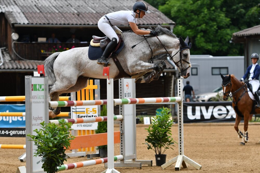 Es könnte momentan nicht besser laufen für die junge Amazone aus Sulmingen. Beim Memminger Springfestival in Schwaben siegte Lea Sophia Gut nun erneut in einem Zwei-Sterne-Springen. Im Gepäck hatte die mehrfache Landesmeisterin diesmal den neunjährigen Schimmelwallach Con Calma, der sich am Vortag bereits in einem S*-Springen an sechster Stelle platzieren konnte. Ein Viertel des Starterfeldes hatte sich für das Stechen des Großen Preises qualifiziert, geführt hatte bis zum Schluss Alina Hertwig auf ihrem Erfolgspferd Lucky mit einer fehlerfreien Runde in der Zeit von 43,26 Sekunden. Doch dann war Lea Gut im Sattel des Cascadello-Sohnes noch einen Tick schneller und luchste der frisch gebackenen Trägerin des Goldenen Reitabzeichens den Sieg ab. Auch mit Chillie Girl, einer bayrisch gezogenen Tochter des Cielito Lindo reihte sich Lea Gut in die Platzierung ein. Platz drei ging an die Polin Weronika Minkiewicz aus Oberstadion, die im Sattel des zwölfjährigen Oldenburgers Chocolate Blue eine souveräne Runde ablieferte. Zu den weiteren Platzierten gehörten Maximilian Ziegler mit Quebec, Christian Brühl und Queen Bella sowie Christoph Kaufmann auf Boston du Banney. Im Youngster-Springen über 1,40m war es Detlef jun. Kaiser aus Geisenhausen, der gleich doppelt ablieferte: Im Sattel der beiden Pferde Conto Blanco und Cornetta vd Horst hatte der Niederbayer ordentlich Gas gegeben und so gelang ihm sogar der Doppelsieg. Dahinter landete India Letizia Fux auf Stromerle, einem Clarimo-Sohn aus der Zucht von Max Dethlefs. Mit Tobias Rist reihte sich ein weiterer Reiter aus dem Ländle in die Platzierung ein.