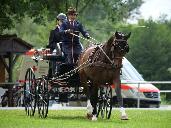 Der Auftakt ist gemacht. In Schwanau-Ottenheim wurden heute die ersten Teilprüfungen bei den Deutschen Meisterschaft der Einspänner gefahren. Insgesamt neun baden-württembergische Fahrer sind mit von der Partie. Vor allem im Starterfeld der Einspänner Ponys sind die baden-württembergischen FahrerInnen stark vertreten. Dort konnte Edwin Kiefer mit einer ausdruckstarken Dressur den zweiten Platz einfahren. Nur der erfahrene Tobias Bücker war besser und siegte. Auch Monika Hallasch zeigte eine tolle Vorstellung und wurde fünfte. Gefolgt von Anna Genkinger auf Platz sechs, die sich somit in eine gute Ausgangslage für ihre Paradedisziplin, das Geländefahren am morgingen Samstag, bringt. Steffen Brauchle mischt auch bei den Einspännern mit und wird Siebter. Katrin Hertkorn-Kiefer, Lea Schmelzer und Katrin Hertkorn-Kiefer platzieren sich auf den Rängen 13, 18 und 19. In der Länderwertung ist das baden-Württembergische Team nach der Dressur somit auf Platz zwei hinter der Mannschaft aus Westfalen.