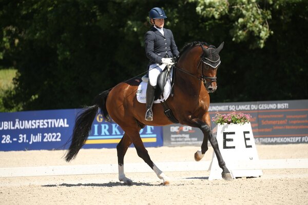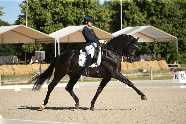 Im Sattel des neuen Landeschampions der Sechsjährigen sitzt ebenfalls Nicola Haug. Sie pilotierte den Topas-Lord Leopold-Sohn Birkhof’s Thapelo FBW mit einer Endnote von 8,3 auf Rang eins der Prüfung. Thapelo stammt aus der Zucht der ZG Martin und Simone Meder und steht in Besitz von Thomas Casper. Thapelo wurde bereits 2019 Vizelandeschampion und auch Vize-DSP-Champion, sowohl 2020 als auch 2021 konnte er sich für das Bundeschampionat qualifizieren – 2020 stand er im stark besetzten Finale. Dr. Plewa bescheinigte Thapelo eine gute Perspektive. Besonders im Trab (8,5) gefiel der Hengst mit viel Schulterfreiheit und sehr guten Trabverstärkungen. Der Schritt war klar geregelt vorgetragen und dabei gut durch den Körper fließend (8,5). Höhepunkt war die Galopptour (9,0): super im bergauf, mit einem fleißig durchfußenden Hinterbein, zeigte Thapelo seine hohe Versammlungsbereitschaft. Auch die Lektionen der Klasse M gelangen Thapelo vorbildlich. Die Seitengänge waren sehr gut vorgetragen, lediglich der zweite fliegende Wechsel misslang, was die Note etwas schmälerte. Dennoch eine souveräne Vorstellung des neuen Landeschampions! Auf Rang zwei landete EMH Rock’n’Rose v. Rock my Soul-Sir Donnerhall I (Z.: ZG Ekkehard und Maria Hellstern, B.: Silvia Walter) unter Anna-Lisa Schepper. Für sie gab es eine Endnote von 8,1. Damit schafften sowohl Thapelo als auch Rock’n’Rose die magische 8,0-Hürde auf dem Weg zum Bundeschampionat!