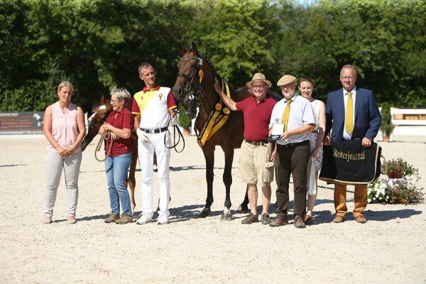 Auf den Namen Chambertine E hört die neue Landessiegerstute Springen! Die 2008 geborene Chambertin-Fierant xx-Tochter siegte zunächst bei den sechsjährigen und älteren Springstuten, am späten Nachmittag gab es dann die zweite Schärpe für sie. Die DSP-Prämienstute (Sport) stammt aus der Zucht von Karl und Dagmar Ederle, in dessen Besitz sie auch unverändert steht. Die Stute gefiel mit ihrem Charme, der klaren 3-Teilung des Körpers und dem trockenen Fundament. In der Bewegung arbeiteten die Hinterbeine stets vorbildlich unter den Körper. Die Stute kann selbst auf Sporterfolge bis zur schweren Klasse im Parcours verweisen.