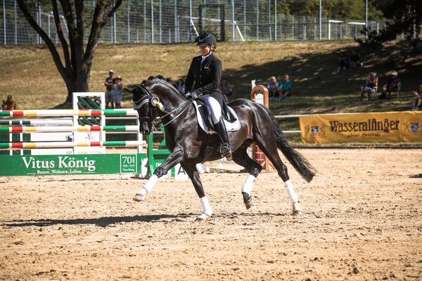 Alle zwei Jahre findet beim Reitverein Aalen das große Dressur- und Springturnier statt. Im letzten Jahr machte dann Corona einen Strich durch die Rechnung und so konnte das Turnier nicht stattfinden. Doch in diesem Jahr ist das Aalener Turnier wieder zurück und das in gewohnter Form mit toller Organisation, super Stimmung und guten Bedingungen. Bei strahlendem Sonnenschein und etlichen Zuschauern wurden zeitgleich die beiden Großen Preise in Dressur und Springen ausgetragen. Im Viereck setzte sich die Zweitplatzierte des Vortages Sabrina Linsenmaier mit starken 71 Prozent durch. Ihr Württemberger Hengst FBW Fiorenzo aus der Zucht von Karin Rettenmaier überzeugte einmal mehr durch viel Ausdruck und punktete besonders in den Trabtraversalen, super zentrierten Galopppirouetten sowie toll bergauf gesprungenen Galoppwechseln. Einzig und allein im Schritt kam der Hengst nicht zur vollsten Losgelassenheit, weshalb der starke Schritt über wenig Übertritt verfügte. Auf dem zweiten Platz folgte Ina Casper mit FBW Dancing Mirena (Z.: Erwin Feichtenbeiner) und 68 Prozent. Das Paar spielte die gemeinsame Routine voll und ganz aus. Zwei Missverständnisse bei den Galoppwechseln nach der ersten Galopppirouette sowie nach dem starken Galopp kosteten Punkte. Yvonne Bernhard und ihr zehnjährigen Wallach For Rock durften sich mit 67,1 Prozent über die weiße Schleife freuen. Das Paar punktete durch eine sehr gleichmäßige Trabtour und sicheren Serienwechseln. Leider gelang die zweite Galopppirouette nicht ganz ideal. Als Letztplatzierte rangierte Carina Hummel mit Dior und 67 Prozent auf dem vierten Platz. Sie zeigten eine sehr sichere Runde, wenn auch insgesamt etwas mehr Schub aus der Hinterhand erwünscht wäre. Schade war, dass das Starterfeld mit neun Startern sehr überschaubar war.