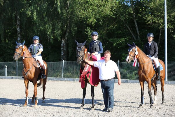 Auf dem Lusshof in Laupheim sind bei den Championaten der jungen Vielseitigkeitspferde die ersten Entscheidungen gefallen. Im Feld der vierjährigen DSP-Youngster siegte der, von Sarah Schmierer präsentierte, Daybreak-Nachkomme Drogon S (MV Kaiserkult) aus der Zucht der Familie Schmierer in Erdmannhausen. Silber ging an an den, ebenfalls aus der eigenen Zucht stammenden, Fuchshengst Hey Lucky Stan (Hickstead White/Stan the Man xx) unter Julia Schmid. Platz drei in der ersten Championatsentscheidung sicherte sich Mon Cherie ZGE (Monte Bellini/High Spirits), vorgestellt von Anna Sophie Engelberth (Z.: ZG Engelberth). Lediglich ein Paar war in der Wertung des Trakehner-Championats der Vierjährigen am Start - somit geht die Schärpe hier an den von Eva Terpeluk gerittenen Uni´s Brown Cookie (Asagao xx/Summertime) aus der Zucht von Wolfgang Martin, der, ungeachtet der fehlenden Konkurrenz, unter anderem mit der 8,2 im Viereck zu überzeugen wusste. Es bleibt spannend auf dem Laupheimer Lusshof, morgen stehen die Entscheidung der Fünfjährigen auf dem Programm. (wentsch/Foto K/E)