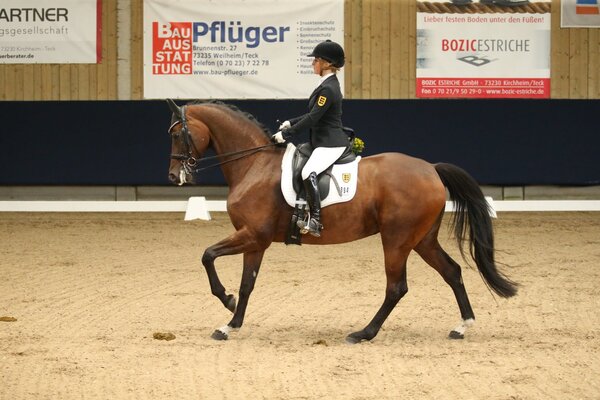 Beim Schafhof Jugendfestival sammelte die Juniorin Malin Kampp mit ihrer elfjährigen Stute Inlana ihre ersten internationalen Platzierungen. An den ersten beiden Tagen rangierte die gut sitzende Kampp auf den Plätzen sieben und sechs, wobei sie dabei schon zweimal eine neue persönliche Bestleistung aufstellte. In der abschließenden Kür gelang ihr eine tolle Runde und so durfte sie sich mit 71,4 Prozent über einen starken fünften Platz freuen. Der Schülerin von Ann-Kathrin Lindner gelang eine weitesgehend fehlerfreie Kür, wobei sie besonders sowohl im Trab als auch im Galopp in den Seitengängen überzeugte. Das Paar punktete ebenso in tollen Verstärkungen. Einzig in den Schrittpirouetten verloren die Beiden einige Punkte. Es scheint so, dass sich Malin Kampp und Inlana in einer guten Form für die bevorstehenden Landesmeisterschaften befinden! (mb)