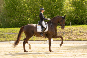 Nach den Nachwuchs-Talenten haben auch die Reiter ihre erste Wertungsprüfung in Meißenheim absolviert. Es siegte klar die Titelverteidigerin Jasmin Schaudt mit ihrem zwölfjährigen Hannoveraner Fano (74,711 Prozent). Zweite wurde Janina Kahl im Sattel ihres 13-jährigen, ausdrucksstarken Emiliano, der wie am Schnürchen piaffierte und passagierte (73,95 Prozent). Nicole Casper und Birkhof’s Don Röschen kamen mit gut gesprungenen Zweier- und Einerwechseln auf Platz drei (72,316 Prozent). Martina Steisslinger, die 2021 Bronze gewann, ritt mit Favory A.S. auf Rang vier (71,132 Prozent). Ann-Kathrin Lindner, amtierende Landesmeisterin U25, erreichte mit Lord of Dance (70,737 Prozent) Platz fünf. (mj)