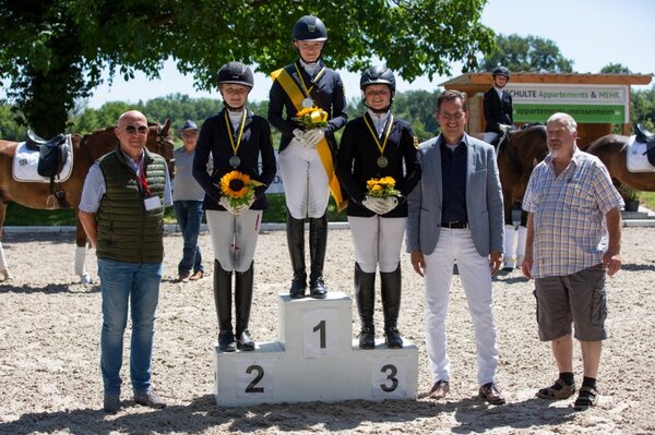 In Meißenheim wurden die ersten Meister gekürt und die Medaillen bei den Children vergeben. Nachdem sie beide Wertungsprüfungen gewinnen konnte, war klar, dass Emelie Hertwig die Goldmedaille nicht zu nehmen war. Die Elfjährige trainiert bei Kathrin Burger und hat mit dem Pferd ihrer Oma, dem 15-jährigen Diamond's Rubioso, einen erfahrenen Lehrmeister unter dem Sattel. Silber geht an Clara Vetter, Bronze erhält Naja Sofie Tribusser. Bei letzter kullerten die Freudentränen auf dem Treppchen, war es doch erst die zweite gemeinsame Prüfung des Paares.