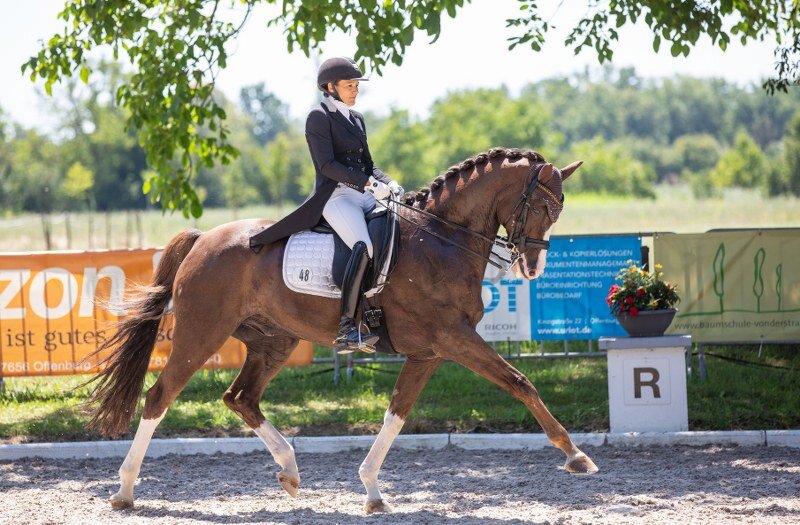 In der Finalprüfung präsentierte Jasmin Schaudt ihren Fano in Topform. Der 12-jährige Hannoveraner piaffierte wie am Schnürchen und leistete sich keine Fehler. 74,56 Prozent vergab das fünfköpfige Richtergremium. Damit konnte sie ihren Titel von 2021 verteidigen. „Die zweite Medaille bedeutet mir aber mindestens genauso viel wie die erste“, freute sie sich. Zweite wurde Janina Kahl mit ihrem 13-jährigen Emiliano, die ebenfalls ihre Stärken in der Piaffe und Passage ausspielen konnten (73,98 Prozent). Nicole Casper und Birkhof’s Don Röschen erreichten Platz drei (72,35 Prozent). Die Fuchsstute überzeugte mit einer ausdrucksstarken Trabtour und sicheren Wechseln, lediglich im Schritt könnte sie sich noch etwas mehr ans Gebiss dehnen. Vierte wurde Martina Steisslinger im Sattel von Favory (71,60 Prozent). Der 12-jährige KWPN-Wallach präsentierte sich sehr elastisch, mit mühelosen Übergängen von Passage in Piaffe, die Galopp-Pirouetten zentriert und gesetzt. Platz fünf ging an Ann-Kathrin Lindner und ihren Lord of Dance (71,19 Prozent). Mit feiner Einwirkung und einem wie immer beeindruckenden gestreckten Sitz präsentierte sie den Württemberger, der sichere Zweierwechsel zeigte. Die erste Piaffe etwas stockend, gelang die zweite deutlich besser. Sechste wurde Anna Casper mit ihrer Erfolgsstute Donna Clara, die sich mit ihrer tollen Leistung auch den Meistertitel in der U 25-Tour sicherte (69,35 Prozent). Platz sieben ging an Katrin Burger und den Lusitano Incrivel (68,98 Prozent). Der Neunjährige begeisterte mit einem sehr guten Schritt in schöner Dehnungshaltung mit viel Übertritt. Die Pirouetten springt er bereits sehr zentriert, vor der Pirouette nach rechts stolperte er kurz, aber seine Reiterin konnte das gut abfangen. Timo Kemmerer ritt mit Sunny Sunday auf Rang acht (68,95 Prozent). Damit holte er sich auch den zweiten Meistertitel in Folge bei den Herren. Annika Gutjahr wurde im Sattel von Sunny Girl Neunte (67,37 Prozent) vor Madlin Zott mit Quadrofina (67,12 Prozent). (mj)