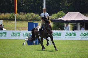 Für die vierjährigen Stuten und Wallache stand heute zunächst die Qualifikation für das Finale auf dem Programm. Mit einer Endnote von 8,5 setzte sich der in Brandenburg-Anhalt gezogene Fürst Fabuloso an die Spitze des Feldes. Mareike Mimberg setzte den bewegungsstarken und imposant auftretenden Don Royal-Quatergold-Sohn (Z.+B.: Frank Klakow) in Szene. Mit keiner Note schlechter als 8,0 empfahl sich das Paar für den Titel. Mit 8,4 dem Siegerpaar dicht auf den Fersen waren heute Christina Winkler und der in Baden-Württemberg gezogene Fürst Fabuloso v. Fürstenball-Alassio's Boy aus der Zucht von Anton Herre und in Besitz von Sophia Deinböck stehend. Für den amtierenden württembergischen Landeschampion gab es im Schritt die 8,0, ansonsten durchgehend die 8,5. Weiterhin erfreulich aus Sicht der Landeszucht: Auf Rang drei folgten gleich zwei weitere Pferde aus Baden-Württemberg. Zum einen Sir Copperfield v. Secret-Belantis I unter Lisa Casper und zum anderen Banksy v. Boss Hoss Dormello unter Sabine Klenk.