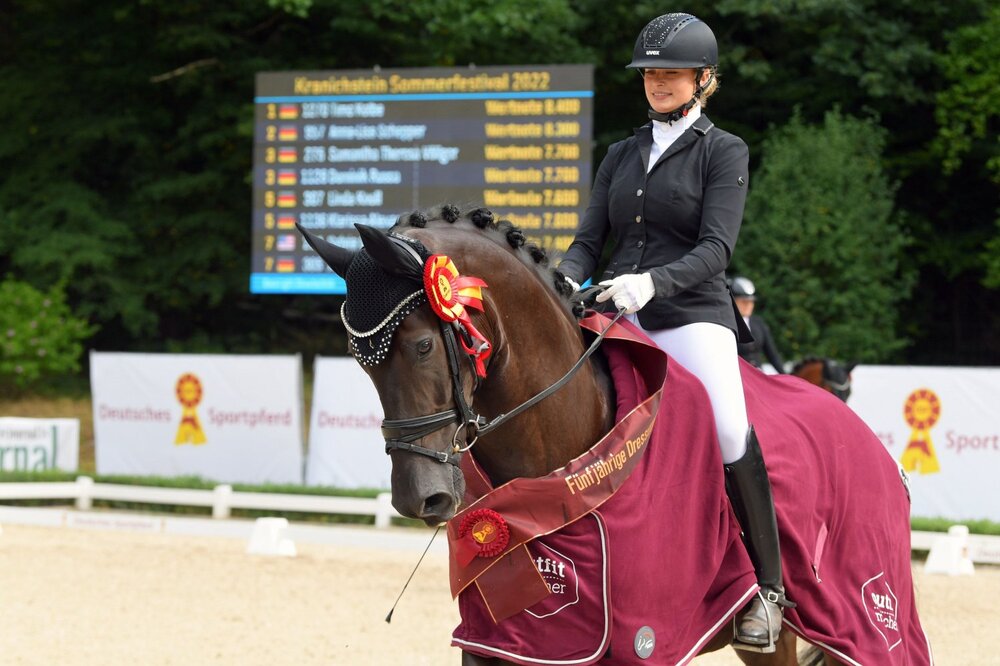 Bei den dreijährigen Hengsten gingen lediglich drei Paare an den Start. Den Sieg sicherte sich der in Brandenburg-Anhalt gezogene Fänomeal v. Fantastic-Desperados (Z.: Pia-Katharina Voigtländer, B.: BG Hoff und Peters) unter Carolin Siebert. Im Schritt gab es für den Rappen die Idealnote 10,0! Insgesamt schlug eine 9,1 zu Buche. Fänomenal wurde 2020 in Neustadt (Dosse) gekört und legte 2021 seinen 14-Tage Test in Schlieckau ab. Rang zwei ging an den in Sachsen-Thüringen gezogenen Vangelis v. Vitalis-Sandro Hit (Z.: Gestüt Elstertal/Steffen Jahn, B.: ZG Familie Casper) unter Birkhof-Bereiterin Nicola Haug. Vangelis wurde letztes Jahr in Marbach gekört und legte seinen 50-Tage Test in Schlieckau ab. Heute gab es für das Paar eine 8,9. Rang drei ging an Delicado v. Destano-Disco-Tänzer (Z.: Franz Biesinger, B.: Saskia Evertz UG & Co. KG) unter Dennis Georg mit 7,8.