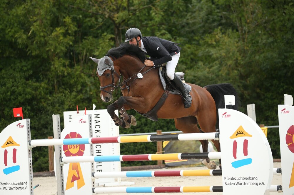 Es ist eine schöne Geschichte: Der Murrhardter Amateur und Träger des Goldenen Reitabzeichen hat den Württemberger selbst ausgebildet, von Springpferdeprüfungen bis hin zu ersten S-Springen vorgestellt. Diese gegenseitige Routine zahlte sich heute aus. Den Umlauf beendete das Paar mit einer sauberen Nullrunde in der zweitschnellsten Zeit. Einzig Verena Kölz, die gestrige Siegerin des S-Springens, war im Umlauf schneller. Im Stechen riskierte der Murrhardter dann alles, nahm enge Wendungen und lieferte eine blitzschnelle Nullrunde in einer Zeit von 39,65 Sekunden. Verena Kölz und ihr 17-jähriger Landor lieferten wie am gestrigen Tag stark ab. Im Stechen reichte die gute Nullrunde in einer Zeit von 40,10 Sekunden jedoch nicht ganz für den Sieg. Mit etwas Abstand zum Spitzenduo folgte Christian Pfeifer mit dem neunjährigen Schimmel Carl Günther. Die Beiden zeigten im Stechen ebenso eine gute Runde ohne Abwürfe (43,71 Sekunden). Daniel Gantner und der erst achtjährige Casall-Nachkomme Caytano lieferten im Stechen die vierte Nullrunde in einer Zeit von 46,96 Sekunden. Der gestrige Zweitplatzierte, Markus Kölz, musste im Stechen im Sattel von SG`s Air Pilot einen Abwurf in Kauf nehmen (40,06 Sekunden). Lucas Wenz durfte sich als schnellster Vierfehlerritt im Umlauf als Letztplatzierter ebenso über eine Schleife freuen.