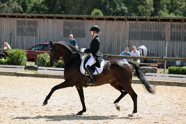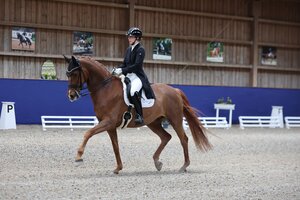 Anna-Louisa Fuchs blickt auf ein äußerst erfolgreiches Wochenende im bayerischen Brünst zurück. Neben zwei M-Siegen mit ihrem Nachwuchspferd, dem siebenjährigen Wallach Fino Royal, feierte sie heute mit ihrem elfjährigen Rizzoli den nächsten Dreisternesieg. Schon gestern rangierte das aufstrebende Paar in der Intermediaire A mit 69,5 Prozent auf einem guten vierten Platz. In dieser Prüfung hatte sie jedoch noch großes Pech mit einem Richter, der sie auf Platz zehn sah, was wertvolle Punkte und eine Topdrei-Platzierung kostete. Ganz nach dem Motto „Neuer Tag, neues Glück“ setzten die Beiden heute noch eine Schippe drauf. Rizzoli hat in den letzten Wochen enorm an Selbstsicherheit gewonnen und kann die Passagen schon viel besser aushalten. So bestachen die Beiden heute durch eine durchwegs vorbildliche Anlehnung, ausdrucksstarke Trabtraversalen und Passagen. Die Piaffen zeigten sich aktiv diagonal abfußend, im noch erlaubten Vorwärts. Die Zweier- und Einerwechsel gelangen fehlerfrei. Einzig die Galopppirouetten hätten noch zentrierer sein können. Am Ende durfte sie sich nicht nur verdientermaßen über den Sieg freuen, sondern ebenso über tolle 71,2 Prozent. Auf Platz zwei rangierte die Erfolgsreiterin des Wochenendes, Alexandra Sessler mit DSP Dun Dee. Mit 70,6 Prozent musste sie sich im Sattel von DSP Dun Dee knapp geschlagen geben. Nach einer guten Trabverstärkung und toll kreuzenden Trabtraversalen folgte eine gute Piaff-Passage-Tour, in welcher man sich jedoch noch mehr Aktivität gewünscht hätte. In der Schritttour sowie in einer sehr gleichmäßigen Galopptour punktete das Paar enorm. Besonders gut gelang die zweite Galopppirouette. Auch Constanze Rügheimer zeigte eine schöne Runde und durfte sich mit dem neunjährigen Danciero und 70 Prozent über den dritten Platz freuen. Mit einer gleichmäßigen Trabtour und fehlerfreien Serienwechseln war die erste Galopppirouette ein Highlight der Prüfung. In der Schritttour verlor sie wertvolle Punkte. Kerstin Kronaus (69,9 Prozent) und Nadine Feser (69,4 Prozent) ritten ebenso in die Platzierung. Ines Knoll rangierte mit High Noon wegen einem halben Punkt und dennoch guten 69,3 Prozent auf dem ärgerlichen ersten Reserverang. In der gestrigen Intermediaire A konnte Claudia Kaiser mit ihrem Blickfang und 67,7 Prozent ihre erste Dreisterneplatzierung feiern und rangierte auf dem fünften Platz. Auch Vera Breidenbach sammelte mit ihrem Pony "Der kleine Donner" und ihrer Stute FBW Füstin Primavera Platzierungen in der M*-Dressur und Dressurpferde M. (msb)