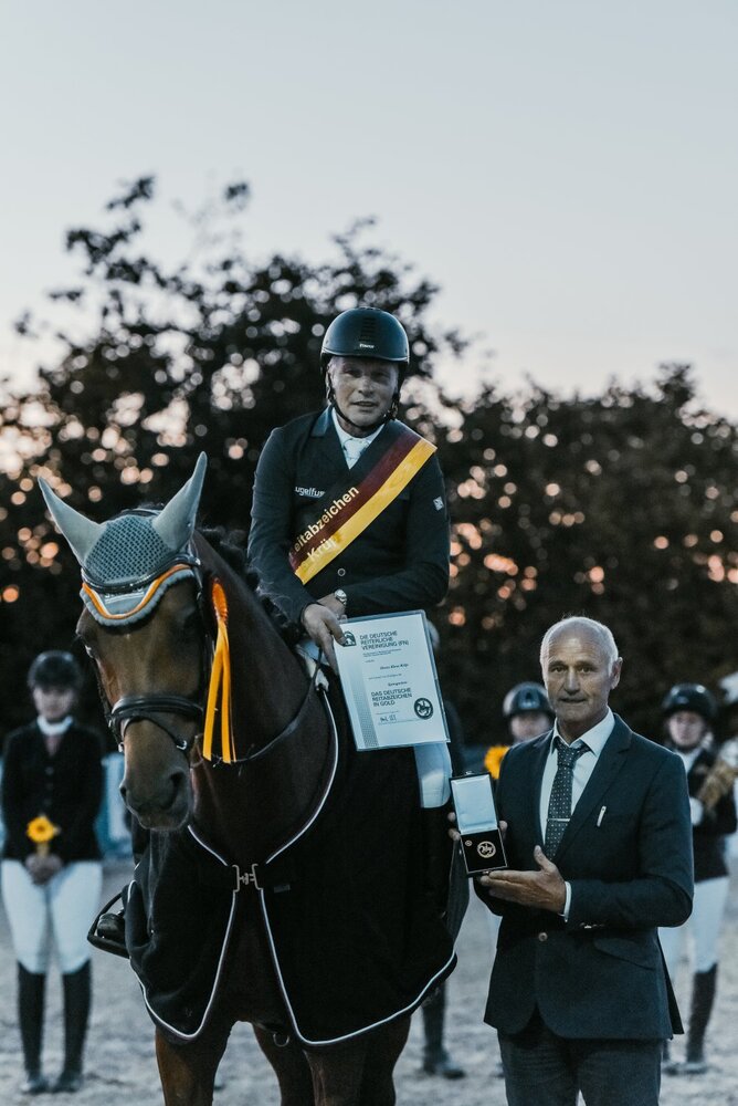 Für den Springreiter und Ausbilder Klaus Krüp aus Nördlingen war der Samstag anlässlich des Horse Summer Meeting beim Reit- und Fahrverein Jagstzell ein ganz besonderer Moment. Bereits im Jahr 2019 hat er mit einem S-Sieg die Voraussetzungen für die Verleihung des Goldenen Reitabzeichens erreicht. Corona bedingt hat er sich entschieden, in diesem Jahr in Jagstzell die Ehrung zu erhalten.Der Veranstalter hat sich enorm ins Zeug gelegt, um diesem Eregnis einen würdevollen Rahmen zu geben. Klaus Krüp, der viele Springreiter in den letzten Jahren in ihrer Ausbildung begleitet hatte, wurde von rund 50 ehemaligen oder aktiven Trainingsteilnehmerinnen und Teilnehmer empfangen. Die Laudatio übernahm Lothar Egetenmeier, der Turnierleiter des Turniers und Weggefährte von Klaus Krüp. Die Herren sind für die Fördergruppe Springen im PSK Ostalb verantwortlich.Sehr gerührt war Klaus Krüp über die zahlreichen Videobotschaften ehemaliger Freunde, die aufgrund der Entfernung nicht an der Verleihung teilnehmen konnten. Seitens der FN hatte der amtierende Richter auf dem Turnier Jürgen Strauß die offizielle Verleihung des Goldenen Reitabzeichens durchgeführt. Nicht nur seine sportlichen Erfolge sondern auch sein Einfühlungsvermögen für junge Pferde und deren Ausbildung sowie ein immer fairer Umgang mit dem Partner Pferd stand bei ihm immer im Vordergrund.Klaus Krüp bedankte sich beim Veranstalter für die feierliche Zeremonie und bei seiner langjährigen Partnerin Carola Röger für die Unterstützung in den letzen 35 Jahren. Der Abend endete mit einer rauschenden Party (le/Foto: Nadine Braun).