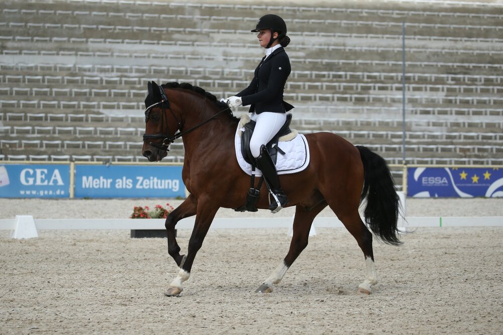 Baden-Württembergs beste Ponyreiter haben beim Marbacher Dressurfestival ebenso die Möglichkeit erhalten, eine weitere Station der beliebten Ponymaster Serie auszutragen. Am Ende setzte sich auch in dieser Tour die Favoritin durch. Mit 73,3 Prozent gab es erneut kein Vorbeikommen an den Vortagessiegern Jana Reichl und ihrem kompakten Belagio. Die Beiden befinden sich momentan an dritter Stelle des Gesamtklassements der Serie und heimsten heute wiederum wertvolle Punkte ein. „Ich bin hier angereist und wollte einfach nur Spaß haben, dass ich nun mit drei Siegen nach Hause fahre, macht mich überglücklich“, beschreibt die strahlende Siegerin. Die 15-jährige kann nun von einem sicheren Finalplatz ausgehen, wo sie noch ein letztes Mal ihre Kür genießen und bestmöglich abschneiden möchte. Nächstes Jahr befindet sie sich nicht mehr im Ponyalter. Auf Rang zwei ritt Clara Kohoutek mit ihren 14-jährigen Nobel Noir und tollen 71,3 Prozent. Die Beiden kommen immer besser zurecht und zeigten hier in Marbach einer ihrer besten gemeinsamen Runden. Die Punkte tun ihrem Konto im Gesamtklassement gut, da sie sich im Moment auf dem zwölften Rang der Wertung befindet. Im Finale beim großen internationalen Turnier vor Schloss Monrepos in Ludwigsburg dürfen die zwölf punktbesten Paare starten. Auch die Drittplatzierte Ann-Sophie Mayr sammelte noch einmal wichtige Punkte. Bei der ersten Qualifikation in Winterlingen stieg die junge Dame mit einem dritten Platz sehr gut in die Serie ein, was sie so nicht nochmal wiederholen konnte. Heute zeigte sie eine sehr harmonische Runde mit Highlights in den einfachen Galoppwechseln und Verstärkungen, was mit 70,8 Prozent und dem dritten Platz belohnt wurde. Auf Rang vier folgte Amelie Bertazzoni mit ihrem Hengst Popcorn WE. Die Beiden kommen nach einer verletzungsbedingten Pause immer besser in Form und durften sich heute über 69,5 Prozent freuen. Lara Theis und ihr Daddy`s Daydream sowie Cecile Mutz und ihr Capri au Lait ritten ebenso in die Platzierung. (msb)