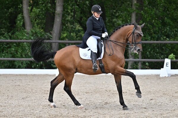 Sie reitet gerade bei jedem Turnier ganz vorne mit. Auch in Gundelfingen zeigte Felicitas Beck wieder tolle, harmonische Ritte mit ihrem Hannoveraner Faido und ihrer Oldenburgerin Gandria. Mit Faido konnte sie die S*-Dressur, Qualifikation für die Kür am Nachmittag, gewinnen (69,496 Prozent). Der Neunjährige war konstant in guter Anlehnung unterwegs, das Genick als höchster Punkt, mit feiner Verbindung zu seiner Reiterin. Viel Übertritt im Schritt, im Galopp, besonders in den Pirouetten, könnte er noch etwas mehr Last aufnehmen. So war bei den fliegenden Wechseln zu vier Sprüngen das linke Hinterbein etwas zu elektrisch, in den Galopptraversalen wurde er teilweise etwas eng. Platz zwei ging an die Legelshursterin Claudia Kaiser mit ihrem erst siebenjährigen Sweetheart (68,333 Prozent). Der selbstgezogene Sezuan-Sohn begeisterte mit viel Schwung im starken Trab, im Schritt könnte er noch etwas mehr untertreten. Seine Reiterin klopfte ihn hier immer wieder lobend. In der Galopptour entwickelt der Braune viel Power, dadurch wurde er teilweise etwas eng. Die Galoppwechsel gelangen sicher und flüssig. Viele Fans im Publikum schenkten Claudia Kaiser stimmungsvollen Applaus nach ihrer Grußaufstellung. Dritte wurde erneut Felicitas Beck, diesmal mit ihrer elfjährigen Gandria (68,256 Prozent). Die großrahmige Stute mit viel Bewegungsqualität trabte in den Verstärkungen mit viel Schub aus der Hinterhand und schritt weit übertretend. Auch die nebenher laut erklingende Musik vom Springplatz brachte sie nicht aus der Ruhe. Die Galoppwechsel gelangen, in der Galopptraversale nach links kam sie etwas ins Laufen, wodurch auch der anschließende Wechsel misslang. Vierte wurde Cosima Gerhardt mit ihrem 17-jährigen Oldenburger Rosenglanz (66,86 Prozent) und erzielte damit ihre erste S-Platzierung. Im Mitteltrab mit gutem Schub aus der Hinterhand kam der Fuchs im starken Trab etwas tief mit dem Genick. Die Galoppwechsel gelangen sicher, die Galopp-Pirouette nach links war sehr klein und gesetzt, nach rechts etwas größer angelegt. Im starken Schritt könnte er sich noch mehr an die Hand seiner sehr korrekt sitzenden Reiterin dehnen.