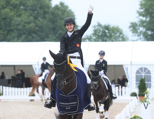 Endlich hat es geklappt & wie! Moritz Treffinger ließ den gestrigen knappen zweiten Platz mit seiner Stute Francis Royal nicht lange auf sich sitzen und setzte heute seine Siegesserie mit seinem neunjährigen Treffinger`s Superstition OLD in der internationalen Jungen Reiter S fort. Mit starken 70,7 Prozent setzte er sich sogar vor Lucie-Anouk Baumgürtel mit ihrem Zweitpferd ZINQ Farlana (70,3 Prozent). Sie hatte erst letzten Monat Mannschaftsgold, Einzelsilber- und Bronze bei der Nachwuchs-EM geholt. Moritz Treffinger hat mit dem heutigen Sieg nun alle Anforderungen für das Goldene Reitabzeichen erfüllt. Die Siege bzw. der Weg zum Goldenen Reitabzeichen hat sich der Ponyeuropameister wahrlich selbst erarbeitet. Denn alle zehn S-Siege holte er sich im Sattel von selbstausgebildeten Pferden. Die ersten Siege sicherte er sich mit seinem Treffinger`s Standing Ovation, der schlussendlich nach Asien verkauft wurde. Sein Wallach Treffinger`s Superstition war in der Vergangenheit nicht immer ganz einfach und ist auch heute teilweise noch umweltorientiert. Moritz Treffinger hat sich durchgekämpft, ihn auf seine Seite geholt und ihn zum Seriensieger der letzten Monate geformt, damit ist der heutige Erfolg sowie das Goldene Reitabzeichen absolut verdient. Im letzten Jahr hat Moritz Treffinger als Trainingsmitglied im CHIO Aachen Campus unter der Obhut von Isabell Werth nochmals einen enormen Entwicklungsschritt gemacht. Auch nach der „Aachener Zeit“ holt sich Moritz Treffinger immer wieder Tipps bei der Dressurqueen, was ihm besonders bei Treffinger`s Superstition OLD, genannt Schnappie, weitergebracht hat. In der heutigen Prüfung überzeugten die Beiden durch toll gesetzte Galopppirouette und ausdrucksstarke Serienwechsel. Er verlor sogar noch ein paar Punkte als der Wallach vor der zweiten Trabverstärkung kurz erschrak und angaloppierte. Auch in den Rechtsseitengängen fand Schnappie nicht immer eine optimale Balance, wodurch er sich teilweise verkantete. Emma Cecilia Lienert und Milena Sophia Sulzer folgten auf Platz drei und vier. Ein weiterer erfreulicher Erfolg war der fünfte Platz von Frederik Leon Steisslinger und seinem Quattani (67,4 Prozent), was seine erste internationale Platzierung war.