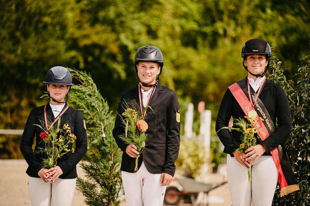 Am Ende zählte die konstanteste Leistung. So legte Vanessa Kölz am Finaltag noch eine Schippe drauf und sicherte sich nach Platz sechs und vier in den beiden ersten Wertungsprüfungen, heute den Sieg im M*-Springen der U16-Springreiter. Schon im letzten Jahr wurde das Nachwuchstalent vom PSV Burkhardshof Württembergische Meisterin in dieser Altersklasse, damals jedoch im Sattel ihres Erfolgspartners Brisbeen. In diesem Jahr startet sie mit Brisbeen bei den Junioren. Den Titel im Championat holte sie sich mit der 19-jährigen Stute Celia und lieferte heute die einzige Nullrunde im Stechen (48,41 Sekunden). Sie setzte sich gegen Colin Sorg und seinen Württemberger Cadeau (Z.: Alfons Sorg) durch, der mit der schnellsten Vierfehlerrunde auf dem zweiten Platz rangierte (37,19 Sekunden). Der gestrige Sieger Lenny Maier rangierte heute mit einem Abwurf in einer Zeit von 40,58 Sekunden auf dem dritten Platz, was ihm in der Gesamtwertung zur Bronzemedaille verhalf. Auch mit seinem zweiten Pferd, der achtjährigen Stute Casita, platzierte sich Lenny Maier auf Rang vier. Chiara Ebrahimi, Führende nach zwei Wertungsprüfungen, erwischte heute mit ihrer hübschen Stute Dragon Queen keinen guten Tag und musste im Umlauf drei Abwürfe in Kauf nehmen, wodurch sie leider auf dem letzten Platz rangierte. In der Gesamtwertung reichte es dennoch zur verdienten Silbermedaille. Emma Pufke und ihre Coccina platzierten sich nach einem Abwurf im Stechen und einer Zeit von 45,25 Sekunden auf dem fünften Platz. Anna Burger und ihr Chacco de Bonville kassierten im Stechen gleich zwei Abwürfe und rangierten am Ende auf dem sechsten Platz des M-Springens. Jannik Ege, Sieger der ersten Wertungsprüfung und Zweitplatzierter in der Zwischenwertung nach zwei Wertungsprüfungen, musste heute im Umlauf einen Abwurf in Kauf nehmen. Dies warf ihn in der Gesamtwertung auf den vierten Platz zurück. (msb)